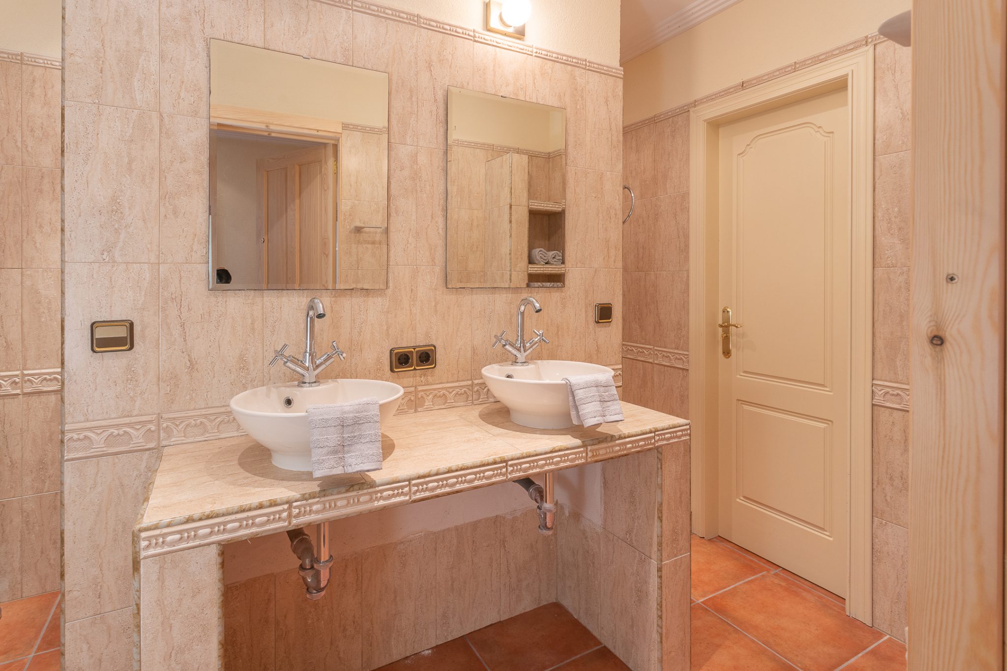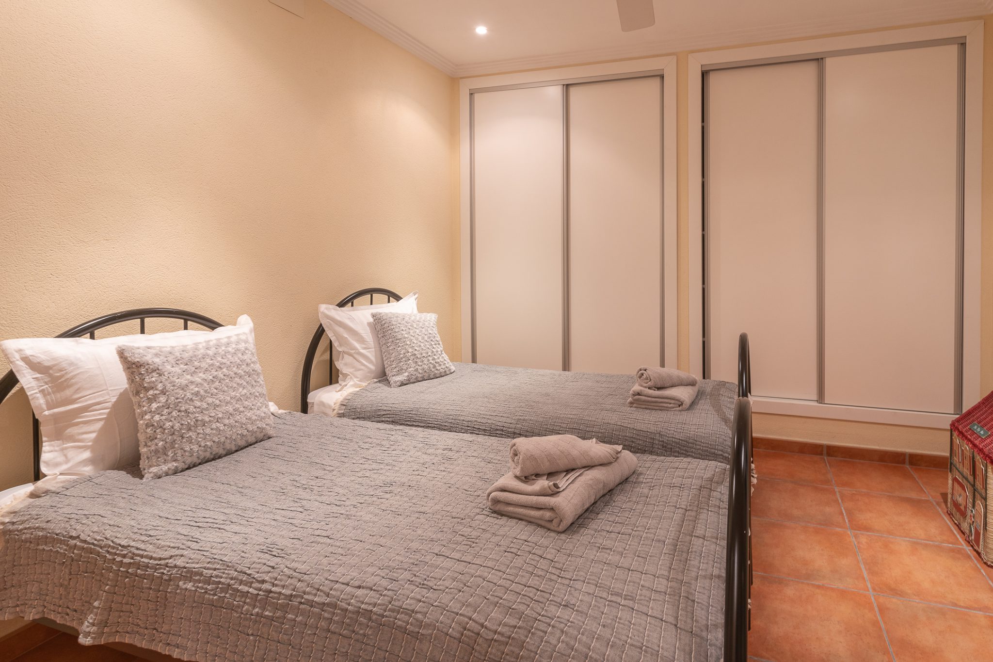 The ground floor includes an open-living with fully equipped kitchen and sofa bed for two persons, two double-bedrooms, two single beds per room, with ceiling fans, a bathroom, a garage and washing area. Outside on the same foor is the pool with sun loungers, an outdoor shower and a bar area. On the top floor you will find the main front-door entrance with also a living area, fully equipped kitchen, bedroom with king-size bed and airconditioner and en-suite bathroom.